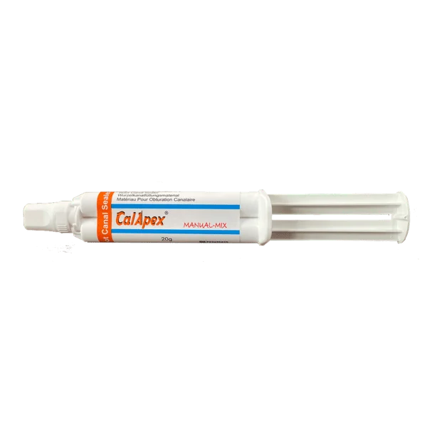 Mixing Calapex (Base/Catalyst Tubes) : Dispense both Base and Catalyst paste to a ratio of 1:1 volume on to a mixing pad and using the spatula mix the paste for 15-20 seconds or until a creamy homogeneous consistency is obtained. Automix Cartridge: Attach the mixing tips to the Automix Cartridge press the plunger of the cartridge to express a homogeneously mixed sealer paste. Manual Mix: Activate the plunger of the manual mix cartridge to dispense both base and Catalyst paste to a ratio of 1:1 volume on to a mixing pad and using the spatula mix the paste for 15-20 seconds or until a creamy homogeneous consistency is obtained. Application of Calapex : As a standard technique, Calapex is used together with gutta-percha or silver root canal points. When a thermoplaticized filling technique is used where most of the canal is obturated by endodontic point material, apply only a light coating of Calapex to the canal walls. For Master-Point-Technique, select a gutta-percha point with the size of the last instrument used for apical preparation. Apply Calapex to the canal walls with the help of the obturation point. Alternatively a lentulo spiral can be used. Avoid the formation of air bubbles in the material and overfilling of the canal by advancing the lentulo spiral slowly to the apex running at low speeds. Withdraw Lentulo very slowly still running at low speed. Working time 15-20 minutes. Dip disinfected and dry points into Calapex and insert them into the canal with a slow pumping motion. Calpex is packaged in a multiple dose container (Tube/Cartridge ). Opening and closing of the container does not affect the shelf life of the device. The dispensed material shall not be placed back in container and the dose once applied and used shall not be reused. Calapex is the endodontic product for every dental practice. It can be used for all established and more recent root canal sealing techniques. It is also suitable for the single point method, thermoplasticize method and all condensation techniques. The setting time of Calapex in the root canal is dependent upon the availability of moisture.