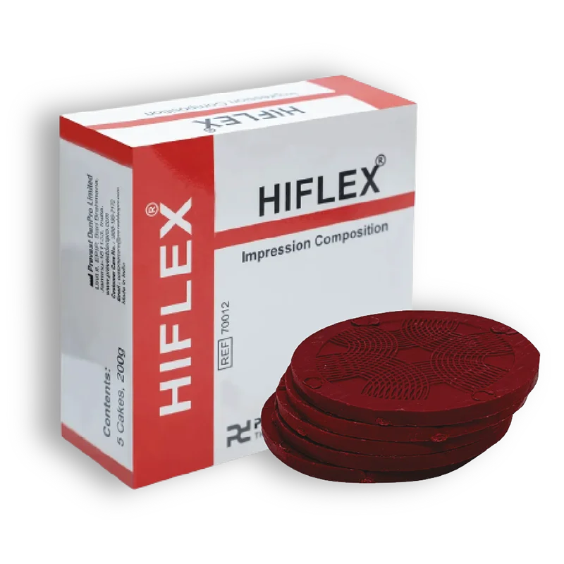 Immerse the required quantity of Hiflex Impression Composition in hot water (55°C / 132 °F). When softened knead thoroughly with the fingers and place in a dry impression tray. Before inserting in the mouth, pour a little cold water over the back of the impression tray. Glaze the surface with dry heat (over a spirit lamp or Bunsen), being careful not to use too much heat, and quickly insert into the mouth. After removal, put in to cold water.